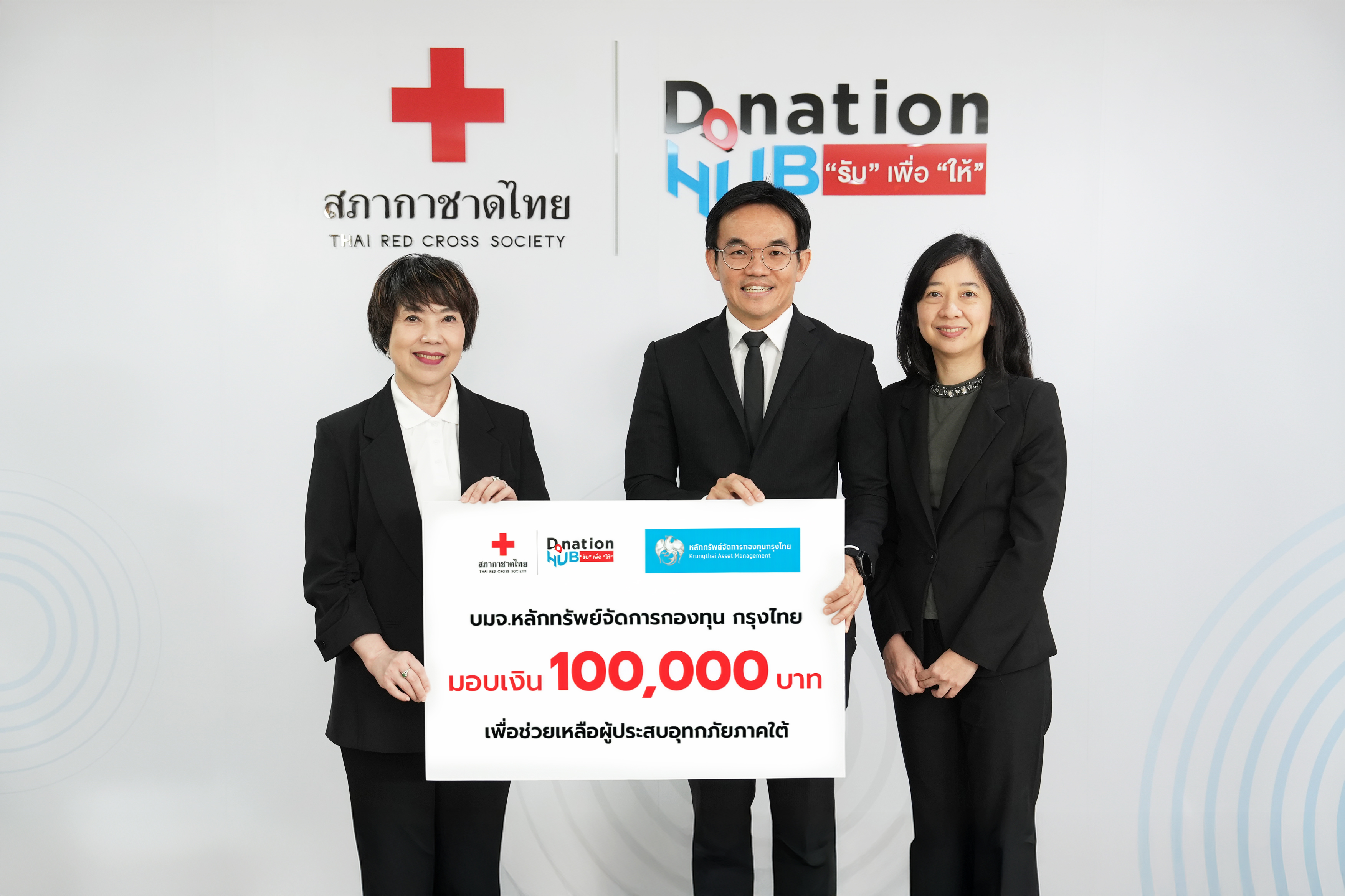 บริษัทหลักทรัพย์จัดการกองทุน กรุงไทย จำกัด (มหาชน) โดยนายยุทธพล วิทยพาณิชกร (กลาง) รองกรรมการผู้จัดการ ผู้บริหารสายงาน ธุรกิจลูกค้าบุคคลและสถาบัน และนางสาววรรณจันทร์ อึ้งถาวร (ขวา) รองกรรมการผู้จัดการ ผู้บริหารสายงานจัดการลงทุน มอบเงินจำนวน 100,000 บาท เพื่อช่วยเหลือผู้ประสบอุทกภัยในพื้นที่ภาคใต้ผ่านสภากาชาดไทย โดยมีนางจันทร์ประภา วิชิตชลชัย (ซ้าย) รองผู้อำนวยการสำนักงานจัดหารายได้ สภากาชาดไทย เป็นผู้รับมอบ ณ สภากาชาดไทย เมื่อวันที่ 8 ธันวาคม 2568 นี้
